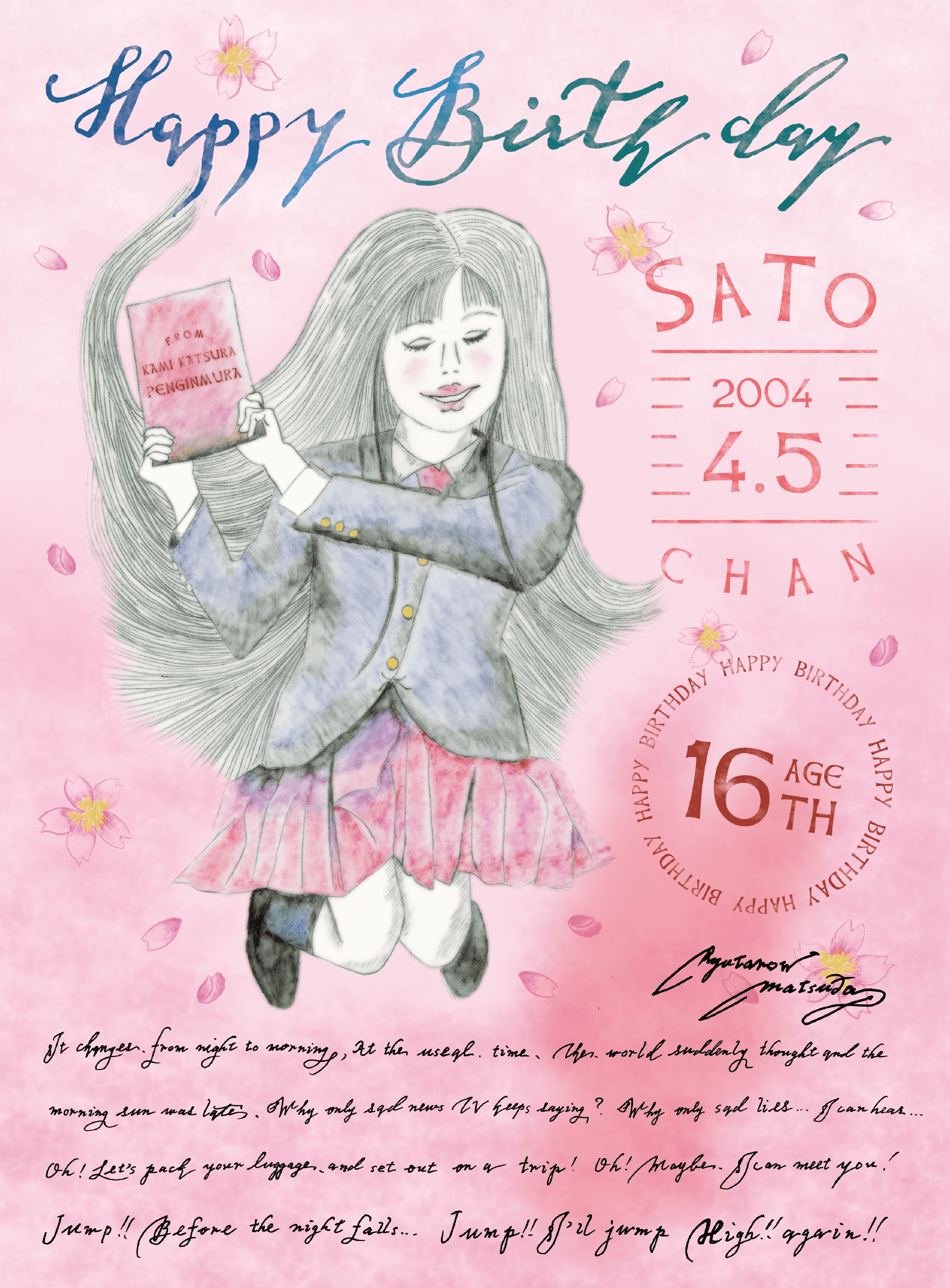 イメージは、当の本人笑顔JUMPと、忌野清志郎さんの楽曲、JUMP。 大切な時間が、奪われてしまったけど、それよりも明るい未来を願ってます。JUMP 夜が落ちてくるその前に JUMP もう一度高く JUMPするよ。HAPPY BIRTHDAY!